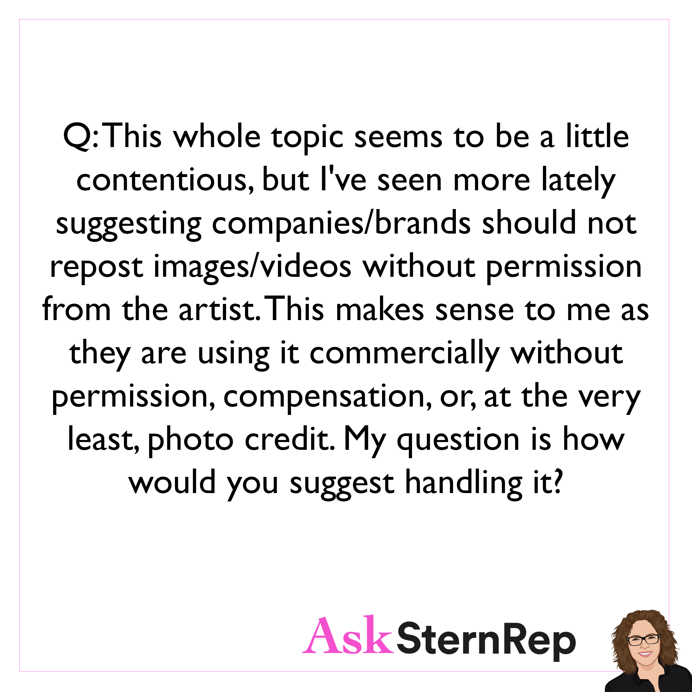 Q: This whole topic seems to be a little contentious, but I’ve seen more lately suggesting companies/brands should not repost images/videos without permission from the artist. This makes sense to me as they are using it commercially without permission, compensation, or, at the very least, photo credit. My question is how would you suggest handling it? A: You are the photographer, so you own the copyright. This is your responsibility to contact whoever used your image without your permission to request to be paid. Unfortunately, IG’s terms don’t support photographers, so I believe if this went to court, you’d lose. It’s important to contact them, let them know you are the photographer and find out where they are using your image. At the very least, you should have your name be tagged to get some PR out of it. I find that clients often don’t know any better and don’t realize they need your permission, so they are open to negotiation.