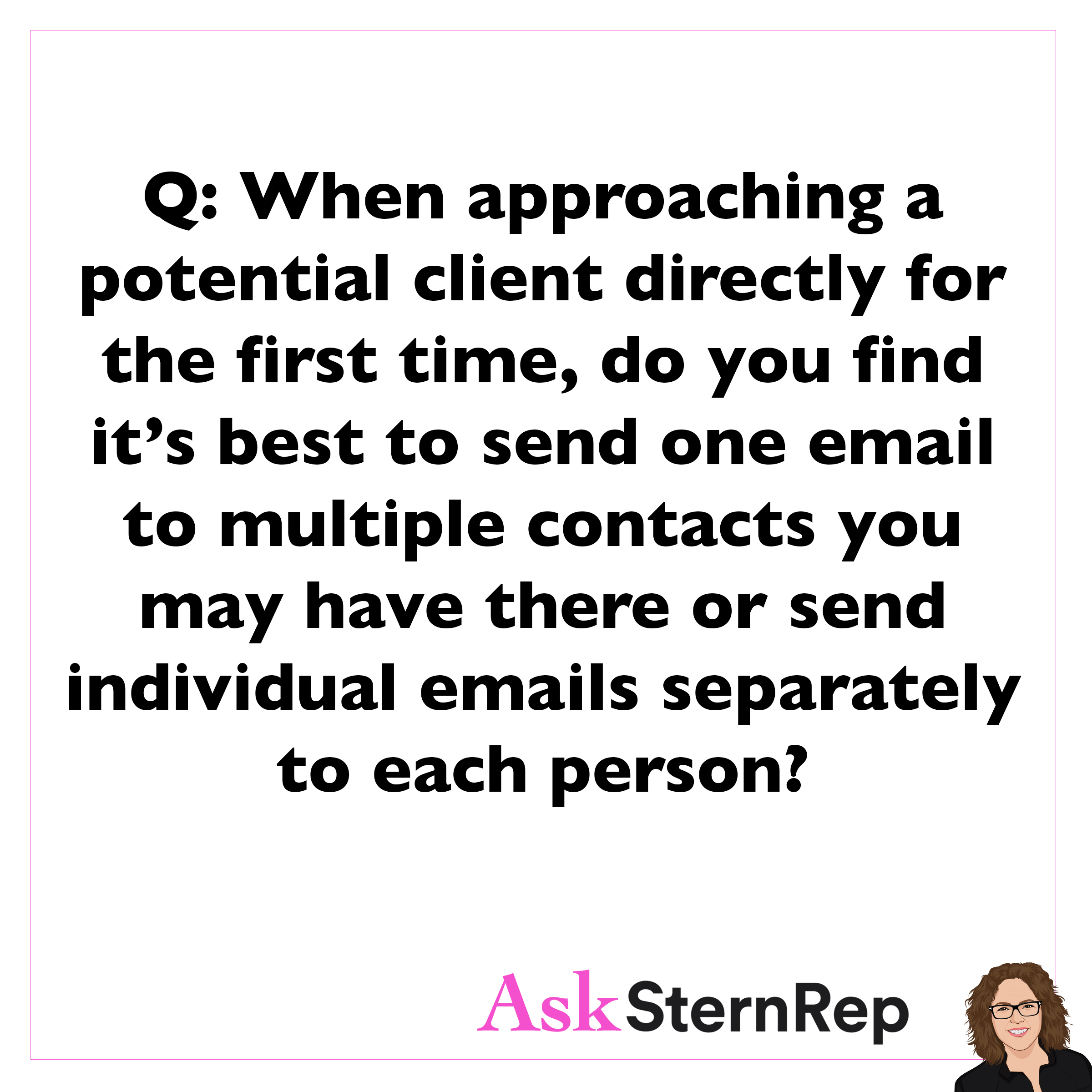Q: When approaching a potential client directly for the first time, do you find it’s best to send one email to multiple contacts you may have there or send individual emails separately to each person? A: Since we are all overloaded with spam, get as personal with each client as possible. Sound like you are only talking to them by using their name (spelled correctly) and mentioning anything you may have in common with them. Do your research on LinkedIn and social media to find some quick points of interest you can touch on. Those are the emails I bet you yourself would want to answer.