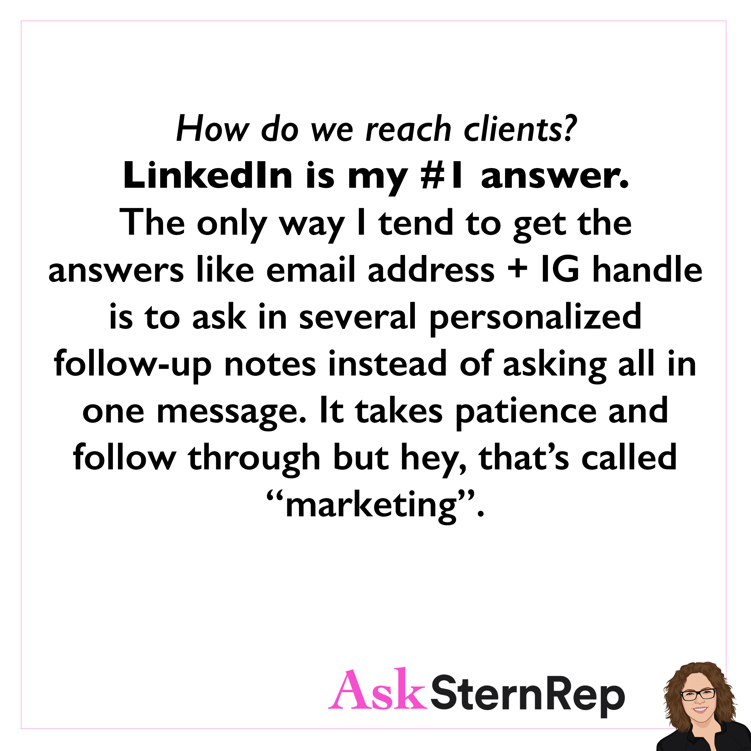 Q: How do we reach clients? A: LinkedIn is my #1 answer. The only way I tend to get the answers like email address + IG handle is to ask in several personalized follow-up notes instead of asking all in one message. It takes patience and follow through but hey, that’s called “marketing”. One of our biggest challenges is figuring out who our clients are and how to reach them. The best way we have found is LinkedIn. Never ask for contact information without a note. Make it a quick note, introduce your name and who you are in two quick sentences. Ask for their email by asking if you can send your promo along with a link to your website. From there you can create a list of emails. We will also add these emails to our Agency Access list. It takes a lot of time and patience to create these lists. It’s very repetitive and it takes a lot of work.